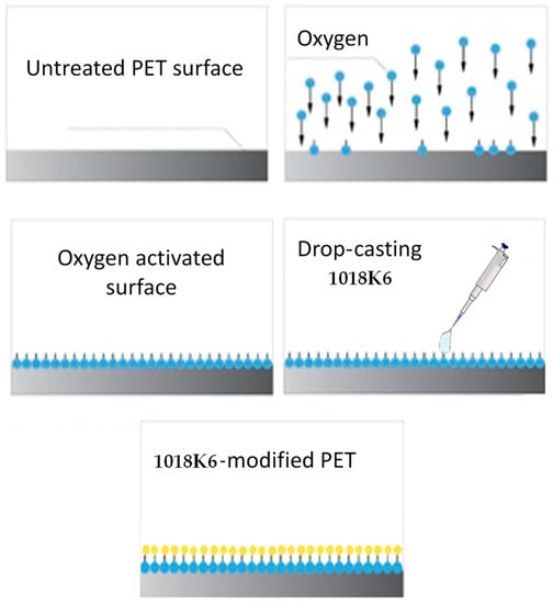 In this work, polyethylene terephthalate (PET), one of the most common packaging materials accounting for more than 90% of the total volume of plastics used, was functionalized with the already characterized AMP, 1018K6. As the PET surfaces appeared to be hydrophobic, i.e., water contact angle greater than 90°, it was impossible to perform the functionalization by incubating them with the antibacterial peptide 1018K6 in aqueous solutions. Therefore, a possible approach was to pre-activate the PET surfaces by using the radio frequency cold plasma technique and oxygen as gas, which induces the formation of reactive -COOH* and -OH* groups [], allowing the covalent binding with the peptide, as sketched in Figure 1.