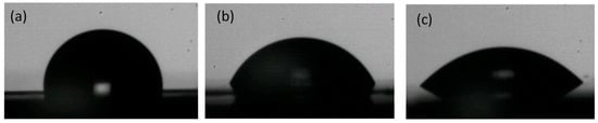WCA measured on pristine PET (a), oxygen plasma activated-PET (b) and 1018K6-functionalized PET (c). The measurements were performed on five samples in duplicate.