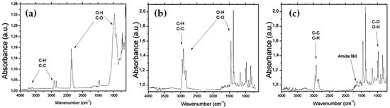 FTIR spectrum of the PET sample before radiofrequency cold plasma treatment (a); after plasma treatment (b); after 1018K6 bio-conjugation (c).