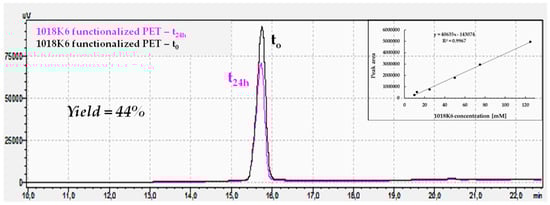 Immobilization yield (%) of 1018K6 on PET surface determined by reverse-phase HPLC chromatography on a C18 column after the coulping reaction (24 h). Pre-activated PET surfaces by plasma were incubated for 24 h with 1018K6 (50 µM) in PBS pH 7.0. The solutions recovered after incubation were further analysed. The peptide solution placed in contact with the pre-activated surface at time 0 (t = 0) was used as control. The chromatograms are representative of three independent experiments. Insert: Calibration curve of the C18 column obtained using different 1018K6 concentrations.