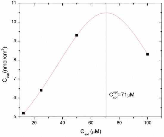 The Holliday model was used to assess the peptide concentration effects on the coverage density and to estimate the concentration value producing the best immobilization yield []. As shown in the dose-response experiments (Figure 5), the most suitable coupling condition to improve the immobilization yield was obtained with a peptide concentration of 71 µM, but 50 μM was selected to perform the further experiments as this value represents a better compromise between the functionalization yield and the peptide costs.