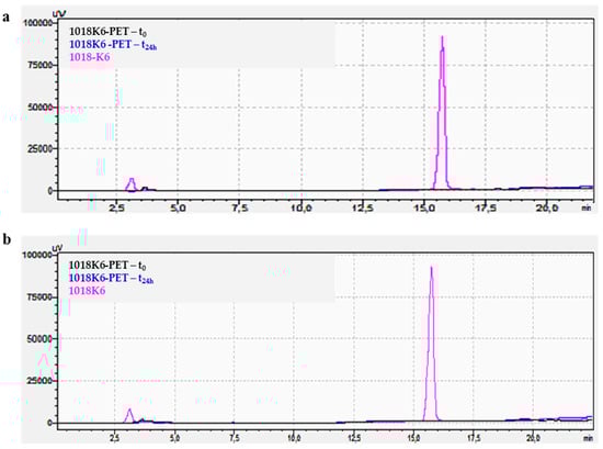In this context, the release of 1018K6 from the functionalized PET into mozzarella cheese brine during 24 h of incubation at 4 °C was analysed by RP-HPLC, using the free 1018K6 as control. As shown in Figure 6a, no peptide-release process occurred from the functionalized polymeric support. The same results were obtained after 24 h incubation in pure water at 4 °C (Figure 6b) and at 25 °C suggesting that the peptide was stably coupled on the polymer. In addition, no leakage of 1018K6 was detectable even after prolonged incubations (until to 72 h) under all the conditions explored. The high stability of the peptide-PET bond is important because in this way the peptide-PET system does not require the related EFSA (European Food Safety Authority) standards.