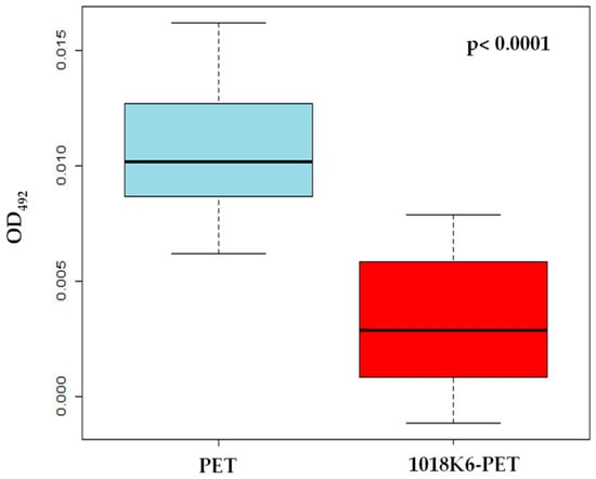 Boxplot of the inhibition activity of the biofilm production of Listeria monocytogenes by PET and 1018K6-PET. Average OD measurements of crystal violet-stained biofilms are shown with error bars representing the standard deviation.