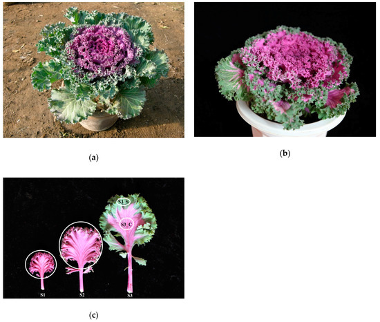 Ornamental kale (Brassica oleracea L. var. acephala) is popular because of its bright color and various leaf shapes. Most ornamental plants bear flowers with various colors and pigmentation patterns, spots, irregular blotches, venation, and others [1]. In other plant species, variegated, striped, transparent, yellow, and spotted leaves are attractive features [2]. Using an isolated microspore culture from the Kamome Red variety (Figure 1a,b), we identified a peculiar bicolor leaf, double haploid (DH) line, Y005-7, of ornamental kale, showing green margins around a red center. The S3 leaf of Y005-7 showed a bicolor leaf, while the S3 leaf of the Kamome Red variety was green. This is a novel ornamental trait with great commercial potential. Thus, to elucidate the mechanism of leaf color formation, it is necessary to investigate the pigment change process.