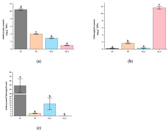 Pigment accumulation in ‘Y005-7’ leaves at different developmental stages. (a) Anthocyanin contents at S1–S3. (b) Chlorophyll contents at S1–S3. (c) Anthocyanin/chlorophyll ratio at S1–S3. Different letters among stages indicate significant differences at p ≤ 0.01 based on the analysis of variance (ANOVA) (Tukey test).