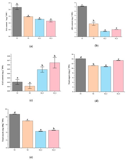 Biochemical analysis of leaves at different developmental stages. (a) IAA content at S1-S3. (b) ABA content at S1–S3. (c) GA3 content at S1–S3. (d) Total sugar content at S1–S3. (e) Starch content at S1–S3. Different letters among stages indicate significant differences at p ≤ 0.05 based on ANOVA (Tukey test).