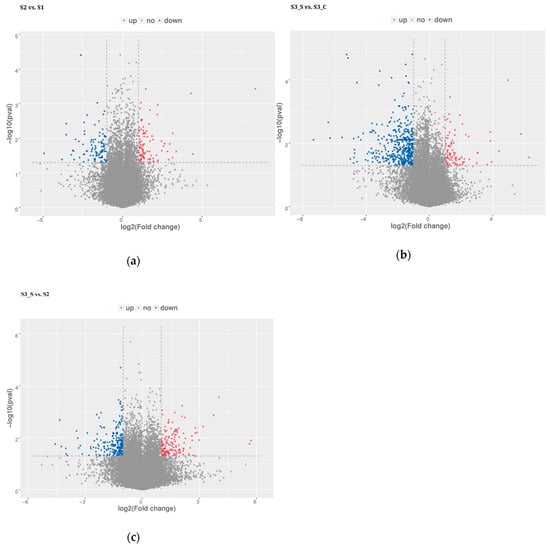 Distribution of differential expressed genes in pairwise comparisons. (a) Differential expressed genes in S2 vs. S1. (b) Differential expressed genes in S3_S vs. S3_C. (c) Differentially expressed genes in S3_S vs. S2.