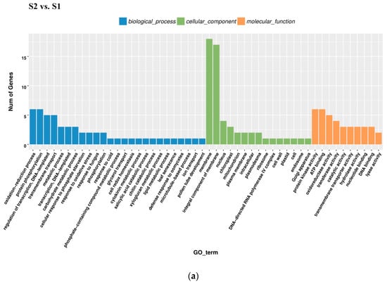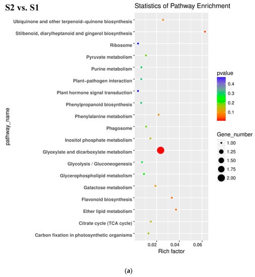 All DEGs identified in pairwise comparisons were searched in the GO (Gene Ontology) and KEGG (Kyoto Encyclopedia of Genes and Genomes) pathway databases. In the S2 vs. S1 pairwise comparison, DEGs were significantly enriched in 49 GO terms as follows: 29 terms for biological process, 18 terms for molecular function, and 1 term for cellular component. The oxidation-reduction process contained the largest number of genes, and therefore anthocyanin degrading might be related with the oxidation-reduction process (Figure 5a). Downregulated DEGs were enriched in 12 pathways, including anthocyanin related ‘Flavonoid biosynthesis’ and ‘Phenylpropanoid biosynthesis’.