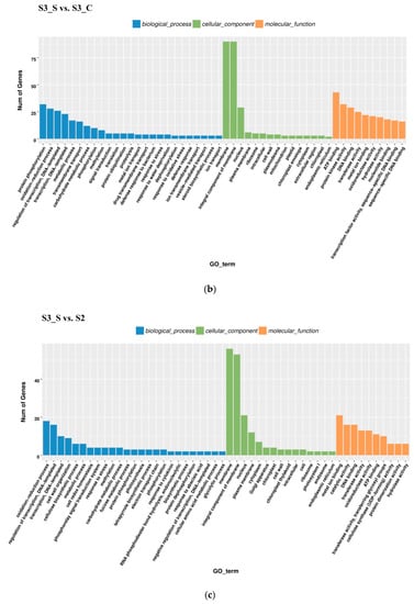 Gene Ontology (GO) enrichment analysis in pairwise comparisons. (a) GO enrichment analysis in S2 vs. S1. (b) GO enrichment analysis in S3_S vs. S3_C. (c) GO enrichment analysis in S3_S vs. S2.