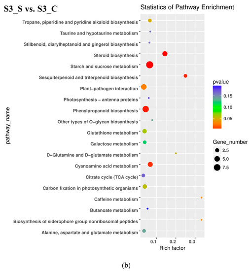 In the S3_S vs. S3_C pairwise comparison, DEGs were significantly enriched in 83 GO terms as follows: 43 terms for biological process, 36 terms for molecular function, and 4 terms for cellular component. Protein phosphorylation included the largest number of genes related with biological process, while oxidation-reduction included the second (Figure 5b). KEGG enrichment analysis showed that the DEGs were significantly enriched in the pathway of ‘Starch and sucrose metabolism’, ‘Steroid biosynthesis’, ‘Phenylpropanoid biosynthesis’, ‘Sesquiterpenoid and triterpenoid biosynthesis’, ‘Cyanoamino acid metabolism’, ‘Plant-pathogen interaction’, ‘Biosynthesis of siderophore group nonribosomal peptides’, ‘Caffeine metabolism’, and ‘Tropane, piperidine, and pyridine alkaloid biosynthesis’ (Figure 6b). Downregulated DEGs were enriched in 43 pathways, including anthocyanin related ‘flavonoid biosynthesis’, ‘peroxisome’ and ‘phenylpropanoid biosynthesis’, while upregulated DEGs were enriched in 7 pathways, including ‘photosynthesis’. Phenylpropanoid biosynthesis is one part of anthocyanin biosynthesis, and changes in this pathway might be related with anthocyanin degrading and bicolor formation at S3.