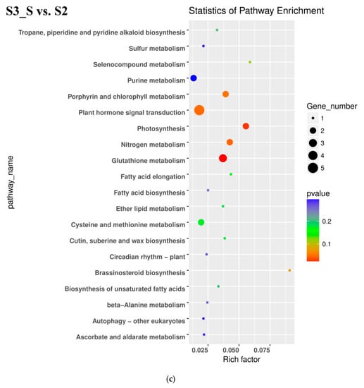 Kyoto Encyclopedia of Genes and Genomes (KEGG) enrichment analysis in pairwise comparisons. (a) KEGG enrichment analysis in S2 vs. S1. (b) KEGG enrichment analysis in S3_S vs. S3_C. (c) KEGG enrichment analysis in S3_S vs. S2.