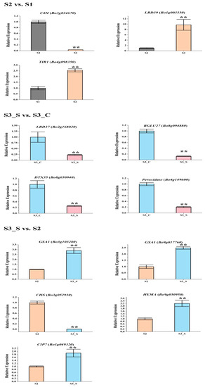 The phenylpropanoid and polyketide pathway contained five Phe-ammonia lyase (PAL), five C4H, nine 4CL, and one ACC1. The early biosynthesis contained seven CHS, two CHI, one chalcone isomerase-like (CHI-L), two F3H and two F3′H, and the later biosynthesis contained two DFR, two ANS, eight UDP-glycosyltransferases (UGTs), one malnoyl-CoA:anthocyanin 5-O-glucoside-6”-O-malonyltransferase (5MAT), and two sinapoylglucose:anthocyanin sinapoyltransferase (SAT). Two TT2, two TT19, and one ANA10 were involved in anthocyanin transport. Gene C4H (Bo3g024670) was significantly decreased in S2 vs. S1. Certain structural genes had relatively higher Fragments Per Kilobase of transcript per million mapped reads (FPKM) at S1 or S2, including CHS (Bo2g146220), F3H (Bo8g081770), F3′H (Bo9g174880) DFR (Bo9g058630), ANS (Bo1g031790), and SAT (Bo3g042330). The FPKM values for most structural genes decreased at S2 (Figure 8). Consistent with the low anthocyanin content at S3_S, the FPKM values for most genes were also very low (Figure 8), and the FPKM values for nearly half of the anthocyanin biosynthesis genes were lower in S3_S than in S3_C. The FPKM values for most of the genes involved in anthocyanin transport (TT12 and AHA10) and modification (UGT, 5MAT, and A3GlcCouT) were ˂1. The FPKM values for nearly half the anthocyanin biosynthesis genes were lower in S3_S than in S2. Gene CHS (Bo3g052930) was significantly decreased in S3_S vs. S2 (Figure 9).