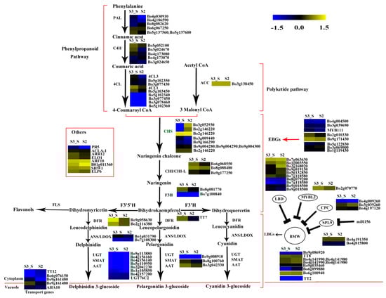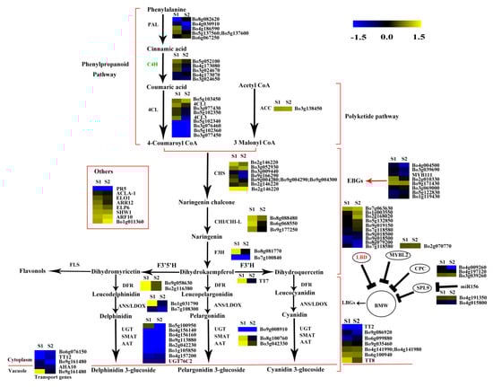 Two of the 34 genes involved in the regulation of anthocyanin biosynthesis were identified as DEGs in pairwise comparisons. LBD39 (Bo1g003550) was upregulated at S2 compared to S1. Almost half of the positive regulatory genes showed a higher expression level at S1 than at S2 (Figure 8). LBD39 (Bo7g118580) and LBD37 (Bo2g168020) were down regulated at S3_S compared to S3_C (Figure 9). One negative regulatory gene, MYBL2, exhibited higher level in S3_S than in S3_C. The expression patterns of the anthocyanin biosynthesis genes were consistent with the changes in anthocyanin content at S2 compared to S1, S3_S compared to S3_C, and S3_S compared to S2 (Figure 10).