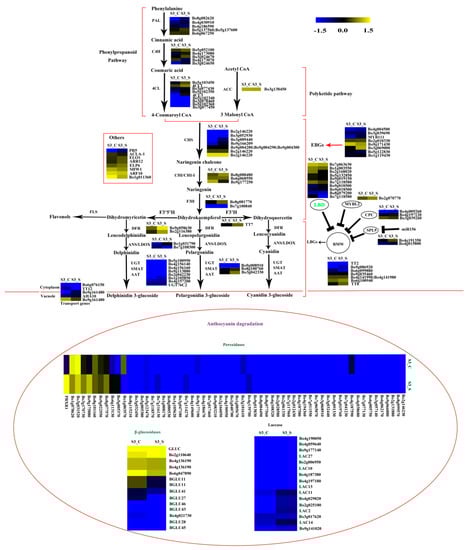 Most studies on anthocyanin degradation have been conducted in juices and fruits, and few have focused on plants. Anthocyanin often accumulates in young leaves and degrades in mature leaves. This may be due to the fact that anthocyanin can protect leaves from UV light and oxidative damaging, and to the gradual accumulation of chlorophyll in plants [21,35,36], which has been reported in some plants, including Chrysobalanus icaco, Photinia sp., and Cocoplum sp. [21,35,36]. Polyphenol oxidase (PPO), β-glucosidases, peroxidases, and laccases have been reported to be involved in anthocyanin degrading in juices and fruits [22,37,38,39,40,41]. PPO was excluded from the candidate gene pool in plants, but the other three kinds of enzymes might be involved in anthocyanin degrading in plants. β-glucosidases often remove the sugar moieties from anthocyanin, and peroxidases further oxidize the aglycone. Both of these enzymes are located in the vacuole. A laccase is responsible for anthocyanin degrading in litchi fruit pericarp [22] through epicatechin-coupled oxidation, and this enzyme is also located in the vacuole. In the present study, 60 peroxidases, 13 β-glucosidases, and 16 laccases were identified (Table S7). Two peroxidases (Bo4g149600 and Bo4g187590) and two β-glucosidases (Bo4g021730 and Bo8g094880) were downregulated in S3_S vs. S3_C. No transcripts of Bo4g149600 and Bo4g021730 were detected in S3_S. These four DEGs might be related with the different anthocyanin degrading rates in the leaf center and margin.