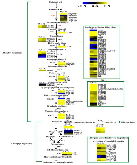 The FPKM values for Bo5g016620, Bo4g012640, Bo9g174500, Bo7g109930, Bo4g112650, Bo9g115140, and Bo1g108220 were ˂1 at all stages. Bo7g077290, Bo9g069300, Bo2g132170, and Bo3g023990 had relatively high FPKM values (Figure S1). Expression levels changed little for 1/3 of the genes, while those of about another 1/3 of the genes at S2 were higher than at S1. The expression level of this gene in S3_S was over two-fold higher than that in S3_C, but no genes were identified as DEGs in S2 vs. S1 and S3_S vs. S3_C (Figure S2). Among the 71 genes involved in chlorophyll metabolism, glutamyl-tRNA reductase (HEMA, Bo9g050950), glutamate-1-semialdehyde 2,1-aminomutase (GSA1, Bo9g017760 and Bo3g103280), and COP1-interacting protein 7 (CIP7, Bo1g049320) were DEGs in S3_S vs. S2, and these genes were involved in chlorophyll biosynthesis. None of the genes involved in chlorophyll cycle and degradation was found to be DEG in S2 vs. S1, S3_S vs. S3_C and S3_S vs. S2 comparisons (Figure 11).