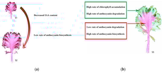 Ornamental kale DH lines ‘Y005-7’ were grown in a greenhouse at Shenyang Agriculture University (Shenyang, China). During its ornamental period, this variety displays a bicolor leaf phenotype consisting of red centers and green margins. This phenotype is gradually formed with leaf development, and can be divided into the following stages: stage 1 (S1), leaves entirely red; stage 2 (S2), red pigment appearing in the centers of leaves and leaf margins slightly green; stage 3 (S3), red leaf centers and green leaf margins (Figure 1b). The S1 stage of leaf development occurred from the end of September to mid-October, while the S2 stage occurred from mid-October to the end of October. Next, the S3 stage occurred from November to March of the following year. In order to eliminate the impact of the main vein with higher anthocyanin content, samples at S1. S2 and S3 were collected from whole leaves without the main vein. Samples were immediately frozen in liquid nitrogen and stored at −80 °C before RNA extraction and anthocyanin, chlorophyll, hormone, sugar, and starch content measurements. Three independent biological replicates were used for the above analyses.