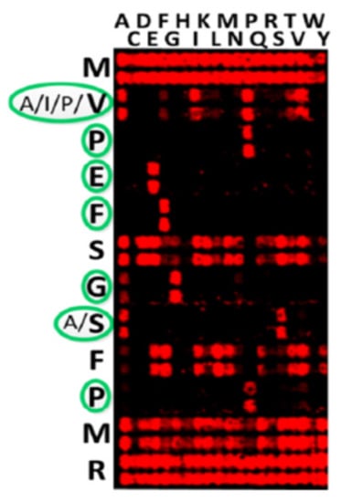 - Weiser, A.A.; Or-Guil, M.; Tapia, V.; Leichsenring, A.; Schuchhardt, J.; Frommel, C.; Volkmer-Engert, R. SPOT synthesis: Reliability of array-based measurement of peptide binding affinity. Anal. Biochem. 2005, 342, 300–311. [Google Scholar] [CrossRef] [PubMed]