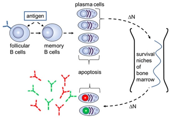 - Radbruch, A.; Muehlinghaus, G.; Luger, E.O.; Inamine, A.; Smith, K.G.C.; Dorner, T.; Hiepe, F. Competence and competition: The challenge of becoming a long-lived plasma cell. Nat. Rev. Immunol. 2006, 6, 741–750. [Google Scholar] [CrossRef] [PubMed]