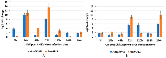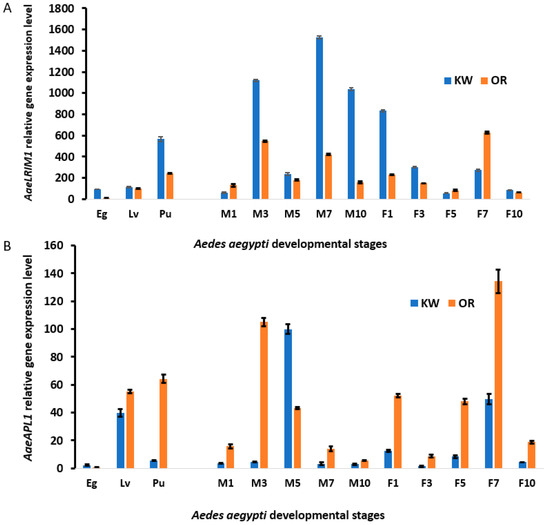 AaeAPL1 gene expressions in response to both ZIKV and CHIKV infection using a time course study. Additionally, we investigated the developmental expressions of these genes in the eggs, larvae, pupae, and adults. The current study aims to improve our understanding of the transcription profiles of
