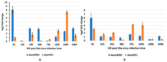 AaeAPL1 followed a different pattern for ZIKV infected mosquitoes, suggesting gene expression changes depend on the particular arbovirus. For both strains of