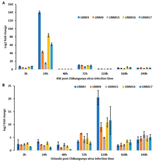 AaeLRIM1 tended to be highest early during infection and declined at later points. In contrast, expression of