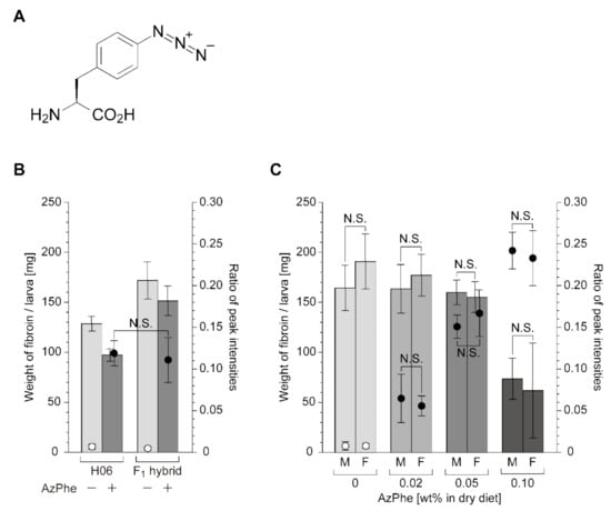 In the above comparison, only male larvae were used for the experiments to avoid data variation due to sex differences. However, in industrial production of silk fiber, both male and female larvae were reared without discrepancy. Varied amounts of AzPhe (0, 0.02, 0.05, or 0.1 wt%) were then administered separately to male and female larvae of the F1 hybrid, H06 × (Nichi509 × Nichi510), to investigate the sex difference as well as to verify the optimal AzPhe concentration in diet. Fibroin production and the AzPhe incorporation rate exhibited no statistically significant differences between male and female larvae (Figure 1C), demonstrating that both male and female larvae of the F1 hybrid were available for industrial silk production. We verified that 0.05 wt% AzPhe in dry diet was optimal to balance fibroin production and AzPhe incorporation (Figure 1C). This result was consistent with the previous result obtained with the H06 line [].