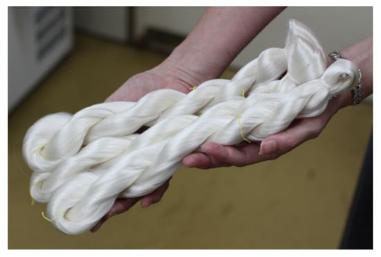 Picture of three bundles of the azido-functionalized raw silk fiber. Around 160 g of raw silk fiber was produced in total by rearing circa 1000 larvae of the F1 hybrid, H06 × (Nichi509 × Nichi510). The larvae were fed AzPhe-containing diet (0.05 wt% in dry diet) on their third day of fifth instar until the start of spinning.