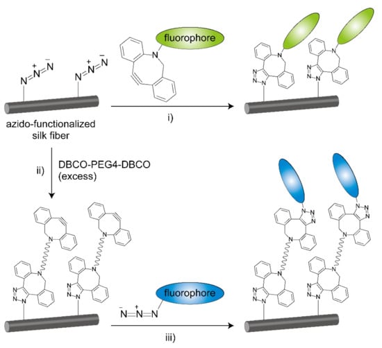 Modification of the azido-functionalized silk fiber with fluorophores by SPAAC. (i) SPAAC between azido groups in silk fibroin and DBCO groups in fluorescent reagents to form stable triazole rings. (ii) Azido groups in silk fibroin can be converted into DBCO groups by the reaction with excess DBCO-PEG4-DBCO. (iii) SPAAC between DBCO groups in silk fibroin and azido groups in fluorescent reagents.