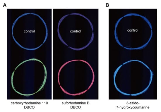 The sericin coating of the raw silk fiber was removed by a degumming process to obtain pure fibroin fiber. To verify the reactivity of azido groups in fibroin, the degummed fiber was treated with fluorescent reagents bearing dibenzocyclooctyne (DBCO) groups. DBCO groups selectively react with azido groups by a click chemistry reaction, strain-promoted azido-alkyne cycloaddition (SPAAC) [,] (Figure 3).