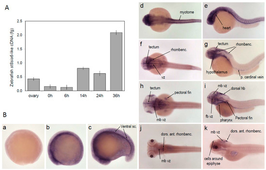 Zebrafish st8sia6-like gene spatio-temporal expression during embryonic and larval development. (A) Absolute quantification of the mRNA levels of the zebrafish st8sia6-like gene was achieved by Q-PCR in ovary, and at 0, 6, 14, 24 and 36 hpf. PCR for two biological samples was carried out in triplicate as described in the materials and methods section, and data are expressed as means +/-SD. (B) The zebrafish st8sia6-like gene distribution was studied by whole mount in situ hybridization with a digoxigenin-labeled Dre st8sia6-like antisense riboprobe. Developmental stage is given as hpf and anterior is to the left: (a) gastrula stage (5 hpf); (b) early somitogenesis (10 hpf); (c) mid-somitogenesis (15 hpf), (d,e) lateral and dorsal views at pharyngula stage (24 hpf), (f,g), lateral and dorsal views at 36 hpf, (h,i) hatching time (48 hpf), (j,k), larva stage (120 hpf).