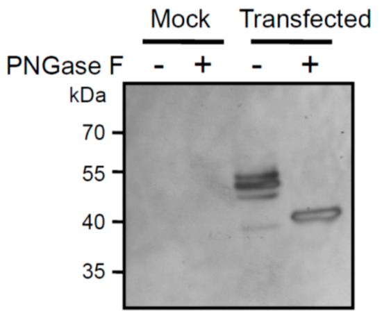 To facilitate functional analyses, a soluble form of the zebrafish enzyme, cytoplasmic and transmembrane domains deleted, was constructed in the expression vector 3xFLAG-CMV9. The truncated cDNA lacking the first 33 amino acid residues of the N-terminus region (Δ33ST8Sia VI-like) was transiently transfected in mammalian cells. As expected, the recombinant FLAG-tagged protein could be detected in the culture medium and cell lysate of the transfected COS-7 cells by Western blot using BioM2 anti-FLAG monoclonal antibody. Although the theoretical molecular mass of the recombinant zebrafish enzyme was 42 kDa, we detected several protein isoforms ranging from 50 to 52 kDa, further suggesting the presence of post-translational modifications (Figure 3). Indeed, we showed that these bands corresponded to N-glycosylated isoforms since peptide N-glycosidase F (PNGase F) treatment induced a shift to the expected 42 kDa. However, it is interesting to note that the relative expression and secretion levels of the zebrafish Δ33ST8Sia VI-like were quite low, similar to the one described for the human Δ27ST8Sia VI [41,54]. It is now accepted that in vivo, most glycosyltransferases assemble to form homodimers or heterooligomeric complexes with other proteins and that these processes modulate their enzymatic activity [55,56]. Sequences flanking the transmembrane domain are often involved in these interactions and thus their removal or the absence of essential co-factors may explain the encountered difficulties in protein folding and secretion.