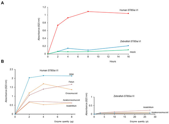 Enzymatic characterization of the ST8Sia VI enzymes using the MicroPlate Sialyltransferase Assay (MPSA). (A) Time course of human and zebrafish ST8Sia activities onto bovine fetuin. Sialylation reactions were conducted at 25 °C for various incubation times (2–16 h) and 100 µM CMP-SiaNAl with either pFLAG-CMV-9/Dre ST8Sia VI-like or mock HEK293-transfected cells (27.5 µL) or 8 µg of recombinant human ST8Sia VI, n = 2. (B) Human and zebrafish ST8Sia activities on various mammalian glycoproteins using the MPSA. Sialylation reactions were conducted for 4 h at 27 °C using potential acceptor substrates (fetuin, asialofetuin, orosomucoid, asialoorosomucoid and bovine submaxillary mucin (BSM) and 100 µM CMP-SiaNAl with variable amounts (3, 10, 27.5 µL) of cell culture media from pFLAG-CMV-9/Dre ST8Sia VI-like or mock HEK293-transfected cells or recombinant human ST8Sia VI (1–8 µg). Data shown on the left side are those corresponding to the human enzyme and those on the right side are those of the zebrafish enzyme, n = 2.