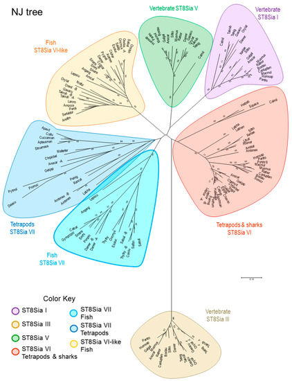 - Teppa, R.E.; Petit, D.; Plechakova, O.; Cogez, V.; Harduin-Lepers, A. Phylogenetic-derived insights into the evolution of sialylation in eukaryotes: Comprehensive analysis of vertebrate beta-galactoside α2,3/6-sialyltransferases (St3Gal and St6Gal). Int. J. Mol. Sci. 2016, 17, 1286. [Google Scholar] [CrossRef] [PubMed]