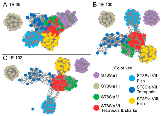 Sequence similarity networks [68] were also used as models to visualize evolutionary relationships between the various mono-α2,8-sialyltransferases and our data confirmed the phylogenic analyses (Figure 6). In the network, the most related sequences are grouped together in clusters. The greatest degree of similarity was found between sequences of the ST8Sia V, ST8Sia VI and the Teleost fish ST8Sia VI-like subfamilies, even at stringent cut-off values (1e-102). Interestingly, the tetrapod and shark ST8Sia VI sequences appear to be closer to the vertebrate ST8Sia V than the fish ST8Sia VI-like sequences. These last analyses casted doubt on the original nomenclature assigned to these fish ST8Sia VI-like sequences [31,35] and further suggested the molecular diversification of fish ST8Sia VI-related sequences among vertebrate mono-α2,8-sialyltransferases, and the possible occurrence of a novel st8sia gene subfamily in teleosts, therefore tentatively renamed ST8Sia VIII in Figure 6.