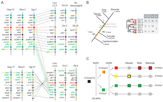 Synteny between the st8sia gene loci and vicinal genes in vertebrate genomes was assessed by manual chromosome walking and reciprocal BLAST searches. Detection of paralogous blocks was achieved and visualized using the Genomicus site (version 92.01) http://www.genomicus.biologie.ens.fr/genomicus-92.01/cgi-bin/search.pl, last accessed August 2018 [73]. When the st8sia gene of interest was absent in a genome, we used genes physically close as a seed to identify syntenic segments. Ancestral genome reconstruction was used in conjunction with phylogenetic and synteny analysis to rapidly assess the dynamic of st8sia genes evolutionary relationships, taking into account the reconstruction of proto-chromosomes of ancestral vertebrates [71,74] and of chordate [72] as previously reported [38,77].