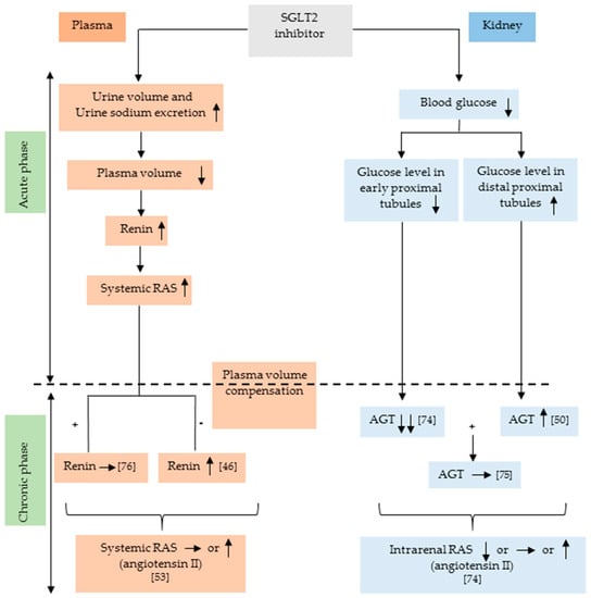 The findings that the beneficial effects of SGLT2 inhibitors on cardiovascular outcomes are observed in the early phase of treatment support the direct diuretic and hemodynamic effects of SGLT2 inhibitors. The transient diuretic effects potentially lead to systemic RAS activation. However, the association between SGLT2 inhibitors and systemic RAS activation is not straightforward. Furthermore, data have indicated that chronic treatment with SGLT2 inhibitors does not activate the intrarenal RAS in type 2 diabetic patients. Future work is thus needed to develop stable biomarkers for both the systemic and intrarenal RAS. To contribute to this unmet need, we have recently developed new assay systems for measuring stable PRA and intrarenal renin activity by calculating the ratio of (total AGT−intact AGT)/intact AGT in plasma and urine respectively [68,69,92].