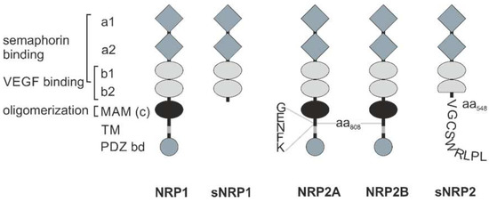 NRPs are evolutionarily conserved cell surface proteins that are expressed by all vertebrates and are widely distributed in adult tissues [13,16]. They form a small family, essentially consisting of two members: NRP1 is a 120 kDa and NRP2 a 112 kDa transmembrane glycoprotein [13,17,18,19,20]. The NRP1 and NRP2 genes are encoded at two different loci on chromosomes 10p12 and 2q34, respectively [21]. Due to RNA splicing, there are different membrane-bound and soluble splice variants of both NRPs; especially NRP2 comes in different variants, NRP2A and NRP2B (Figure 1) [22,23,24,25,26]. This diversity is further enhanced by optional insertion of 5, 17, or 22 amino acids C-terminal to amino acid 808 in the membrane-proximal part of the NRP ectodomain. The extracellular portion of NRP1 and NRP2 consists of two Cubilin homology (CUB) domains (a1/a2), two FV/VIII domains (b1/b2), and a meprin/A5-protein/receptor protein-tyrosine phosphatase mu, or for short, MAM (c) domain [16]. The CUB domains have significant homology with complement factor C1s/C1r, Bone Morphogenetic Protein 1 (BMP1), and Tolloid proteins, while the FV/VIII domains are homologous with the coagulation factor FV/VIII, a receptor-type tyrosine kinase DDR, and discoidin-1. The third (c) domain is often referred to as MAM domain, corresponding to the abbreviation of meprin, A5 (former name of NRP), and receptor-type protein-tyrosine phosphatase mu and kappa (PTPμ, κ) [27,28]. There are soluble NRP variants, sNRP1 and sNRP2, consisting only of these tandem a1/a2 and tandem b1/b2 domains, while lacking the MAM domain, as well as the transmembrane and cytoplasmic domains. The transmembrane domain spans the plasma membrane once and links the ectodomain with a comparatively short cytoplasmic region, which is 44 amino acids in length in the case of NRP1, and 42 and 46 amino acids in length for NRP2A and NRP2B, respectively. None of the membrane-anchored NRP variants has a cytosolic tyrosine kinase domain [16,22]. Instead, the variants, NRP1 and NRP2A, possess a PSD-95/Dlg/ZO-1 (PDZ) binding motif at their intracellular carboxyl termini [16].