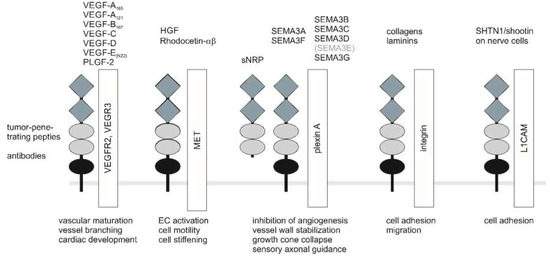 Furthermore, several members of the semaphorin family also bind to NRPs [95,129]. As physiological mediators of antiangiogenic cues, they play an inhibitory role in tumor angiogenesis and tumor growth in addition to their involvement in neuronal development as soluble chemorepellents [130].