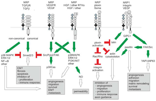 Neuropilin-1-triggered signaling pathways in the tumor vasculature and the tumor microenvironment. With two NRPs, numerous receptor/coreceptor combinations are possible, which can trigger a large number of cellular responses. For clarity, only monomers of receptors and coreceptors are shown. For signaling, dimerized ligands bind to a NRP dimer that interacts with a pair of receptor type kinases or plexin receptors. Activating and inhibitory signals are indicated in green and red, respectively. The resulting effects are indicated by open arrows. Modified from [174].