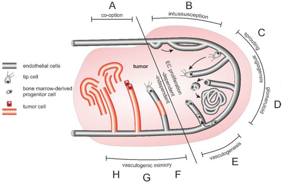 The multifaceted tumor vasculature can arise in various ways (Figure 4): Essentially, the tumor vasculature becomes permanently activated and forms new vessels from preexisting ones by sprouting of EC strands that form a lumen and anastomose. By recruitment of pericytes and smooth muscle cells, and formation of a new basement membrane these newly formed vessels are finally stabilized [308]. In addition to sprouting angiogenesis, tumor vascularization can take place by vessel co-option, intussusception, vasculogenesis, and vasculogenic mimicry [309]. Proliferation of tumor cells along existing vessels occurs at all tumor stages but predominantly early in tumor growth and is referred to as vessel cooption [312,313,314]. Neovascularization by intussusception is likewise more energy saving and faster than sprouting angiogenesis [315,316,317]. Here, the lumen of a preexisting vessel is split by EC columns growing into the lumen and expanding to form a new vessel wall. This occurs among others in gliosarcoma multiforme, melanoma, breast and colorectal cancer [315,316,317]. Tumor vessels can also be formed vasculogenically by recruitment of bone marrow-derived EPCs that differentiate into ECs [305,318,319,320]. Moreover, tumor endothelial cells (TECs) can be of different origin and thus very heterogeneous [321]. In vasculogenic mimicry, the blood supply of tumor tissue can furthermore be supported by conduits in which ECs are only partially or not at all involved. VM is significantly promoted by hypoxia and is associated with a transdifferentiation of CSCs, increased cell plasticity and facilitated metastasis [322,323,324]. As a result, VM channel-lining tumor cells phenotypically mimic ECs. These differ from normal ECs in their expression of NRP1, TIE-1, VEGF-C, endoglin, TFPI1, LAMC2, and EphA2. They also distinctly lack TIE-2, VEGFR1, VEGFR2, P-selectin, VCAM-1, and CD31 [322].