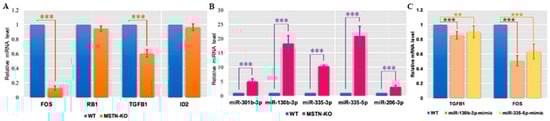 2.2. Identification of Differentially Expressed Genes (DEGs) and Differentially Expressed miRNAs (DEMs) in MSTN-KO Cells