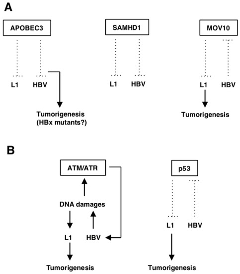 L1-related genes in HBV-related HCC. (A) Host defense genes against L1. APOBEC3s suppress L1 retrotransposition and HBV replication. Some APOBEC3s generate HBx mutants that cause gain of function, enhancing its oncogenic properties. SAMHD1 also inhibits both L1 retrotransposition and HBV replication. MOV10 is downregulated by HBV infection, which may upregulate L1 retrotransposition and accelerate tumorigenesis. (B) L1-related DDR genes. HBV appears to induce DNA damages, which can activate the ATM/ATR pathway, required for efficient HBV replication. On the other hand, HBV-induced DNA damages can potentiate L1 retrotransposition and cause genomic instability. HBV inactivates p53, which can activate L1 retrotransposition.