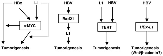 Although L1 is likely to be involved in the oncogenic processes of HBV-related HCC, it has not yet been demonstrated whether HBV indeed modulates L1 retrotransposition. HBV genes often contribute to the development of HCC. Among them, HBx is the best-studied viral protein in HBV-related HCC. HBx associates with various host factors in multiple cancer-related biological pathways. Therefore, HBx may be a candidate that modulates L1 expression and/or retrotransposition, by which oncogenic processes are potentiated. At present, we cannot exclude the possibility that other HBV proteins contribute to the regulation of L1 activity. Further investigation will be required for clarifying this point. Intriguingly, we have demonstrated that another oncogenic virus, Kaposi’s sarcoma-associated herpesvirus, can enhance L1 retrotransposition [140], which may highlight the importance of L1 in HBV-mediated oncogenesis.
