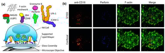 Studying NK cells using supported lipid bilayer (Figure 3a) has arisen relatively recently, but has already provided some highly valuable insight into the structure and function of the NK immune synapse. An early example of such a study is the work of Liu et al., in which lipid bilayers with incorporated ligands for the NK cell receptors NKG2D (CD314), 2B4 (CD244), and LFA1 were used to image activated NK cells by total internal reflection fluorescence (TIRF) microscopy []. In particular, this study explored the critical role of ICAM-1, the ligand for LFA-1, for the formation of an organized immune synapse, as well as the regulation of synaptic formation by 2B4, NKG2D, and LFA-1 receptors. Interestingly, a similar synaptic regulation was observed in this study at a synapse formed between two cells, confirming that supported lipid bilayers faithfully reproduce biological processes that occur at the real cell-cell interface. Later, Zheng et al. used stimulated emission depletion (STED) microscopy to image the clustering of activating receptors, perforin, and actin within the NK immune synapse, with a resolution much higher than that allowed by standard confocal microscopy [] (Figure 3b). This paper, as well as the paper of Bertolet et al. [], provide detailed protocols for the preparation of supported lipid bilayers, their functionalization with ligands, and imaging of NK cells stimulated into these bilayers.
