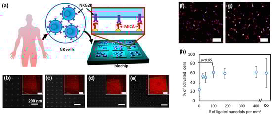 Nanoimprinted chip for the study of the role of the spatial distribution of activating receptors in the immune activation of NK cells. (a) Scheme of the chip (b–e) SEM images of nanodot in different matrices with the periodicity of 200, 150, 100, and 50 nm, receptively. Scale bar: 200 nm. Insets: Florescent image of the matrices functionalized wit MICA and immunostained with AlexaFluor 568 tagged antibody. Scale bar in insets: 50 µm. (f,g). Fluorescent imaging of CD107a (white) in the NK cells activated on the matrices with 400 nanodots per μm2 and 50 nanodots per μm2, respectively. The cells were also stained for cytoskeleton (red), nuclei (blue). Scale bars: 50 μm (h) % of activated cells vs. the nanodot density. Here ∞ means continues AuPd layer functionalized with MICA, providing the maximal ligand density. Analysis of variance was performed to assess the significant changes in the percentage of activated cells on different matrices. The results were considered significant for p < 0.05. Reproduced from Reference [] with permission from The Royal Society of Chemistry.