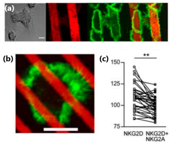 Applications of microcontact printing to the study of NK cells included the fabrication of antigen micropatterns, which bind NK cell receptors in a site-selective manner, and thus control their clustering within the NK cell membrane. For instance, Culley et al. used microcontact printing to produce alternating microstrips of NKG2D antibodies and isotype-matched control mAb, or alternating microstrips of NKG2D antibodies and a mix of NKG2D antibody and inhibitory NKG2A antibody []. They found that the spreading and actin polymerization of NK cells plated on these antigen patters were confined to the strips of NKG2D antibody (Figure 5a). Interestingly, this confinement was observed even for microstrips narrower than the cell size, for which one cell could contact a few strips: The intensity of f-actin staining was significantly higher in areas within the cell that directly contacted strips of NKG2D antibody, as compared to the areas that contacted strips with the inhibitory antibodies (Figure 5b,c).