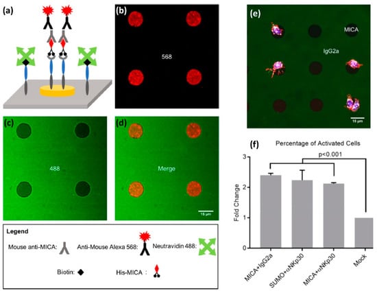 Site-selective functionalization of a photolithographic pattern with two ligands for NK cell receptors. (a) Orthogonal functionalization of TiO2/Au surface (b) Fluorescent image of Au disks functionalized with His-MICA, and stained with mouse anti-MICA and anti-mouse Alexa 568. (c) Fluorescent image of TiO2 background functionalized with Oregon Green 488-labeled NeutrAvidin. (d) Merging images (c,d) confirm the site-selective functionalization. (e) Primary NK cells stained with Alexa Fluor 555 phalloidin to visualize the cytoskeleton, DAPI for nuclei, and APC-labeled anti-CD107a as a marker for NK cell activation (f) Percentage of CD107a positive cells on various regions of the substrates. Analysis of variance and Tukey’s post hoc test were performed to assess the significant changes in behavior. The results were considered significant for p < 0.05. p-Values are also reported for comparisons of interest. Reprinted with permission from Reference [].