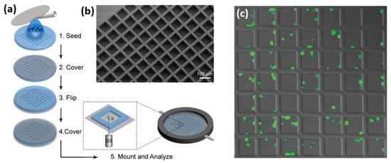 Chip with microwells for confinement. (a) Chip fabrication. (b) Scanning electron microscope of the chip structure. (c) NK cells within the chip after 2 h of incubation. Reproduced from Reference [].