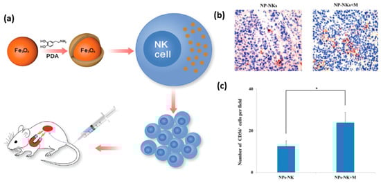 Functionalized nanoparticles for magnetically guided delivery of NK cells. (a) Scheme of the entire experimental setup. (b,c) Distribution and quantitative analysis of the particle labeled NK cells administered by intravenous injection and accumulated at the tumor site after 12 h, with and without magnetic field (Mag: 200×; * p < 0.05). Reproduced from Reference [].