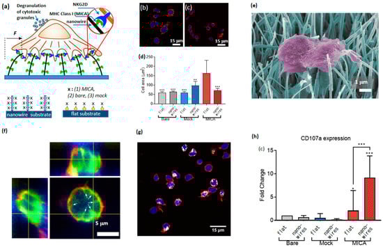 The first evidence of mechanosensing in NK cells was recently provided by Barda-Saad and co., who showed that NK cell response is mediated by actomyosin retrograde flow []. Shortly afterwards, the authors of the present review provided a direct evidence for mechanosensing of NK cells []. For this purpose, we developed a novel platform for the study of the cell mechanical activity, which was based on nanowires—quasi 1D nanostructures whose aspect ratio can exceed a few orders of magnitude. We grew dense arrays of vertical nanowires with a diameter of 50 nm and length of 20 µm, using chemical vapor deposition, and seeded primary NK cells on top of the arrays. The ultra-high compliance of the nanowires to the forces applied by NK cells provided mechanical stimuli for NK cell activation. In addition, we provided NK cells with biochemical stimuli by functionalizing the nanowires with MICA ligands. To that end, we coated the nanowire surface with NTA terminated thiols, chelated Ni to the NTA moieties, and conjugated to the formed chelate His-tagged MICA. To study the effect of the mechanical and biochemical stimuli separately, and in combination with each other, we plated NK cells on nanowires and on control flat surfaces covered with Au nanoparticles; in each case, we used three types of functionalization: Bare surfaces, MICA, and mock ligands (six conditions altogether, Figure 10a).